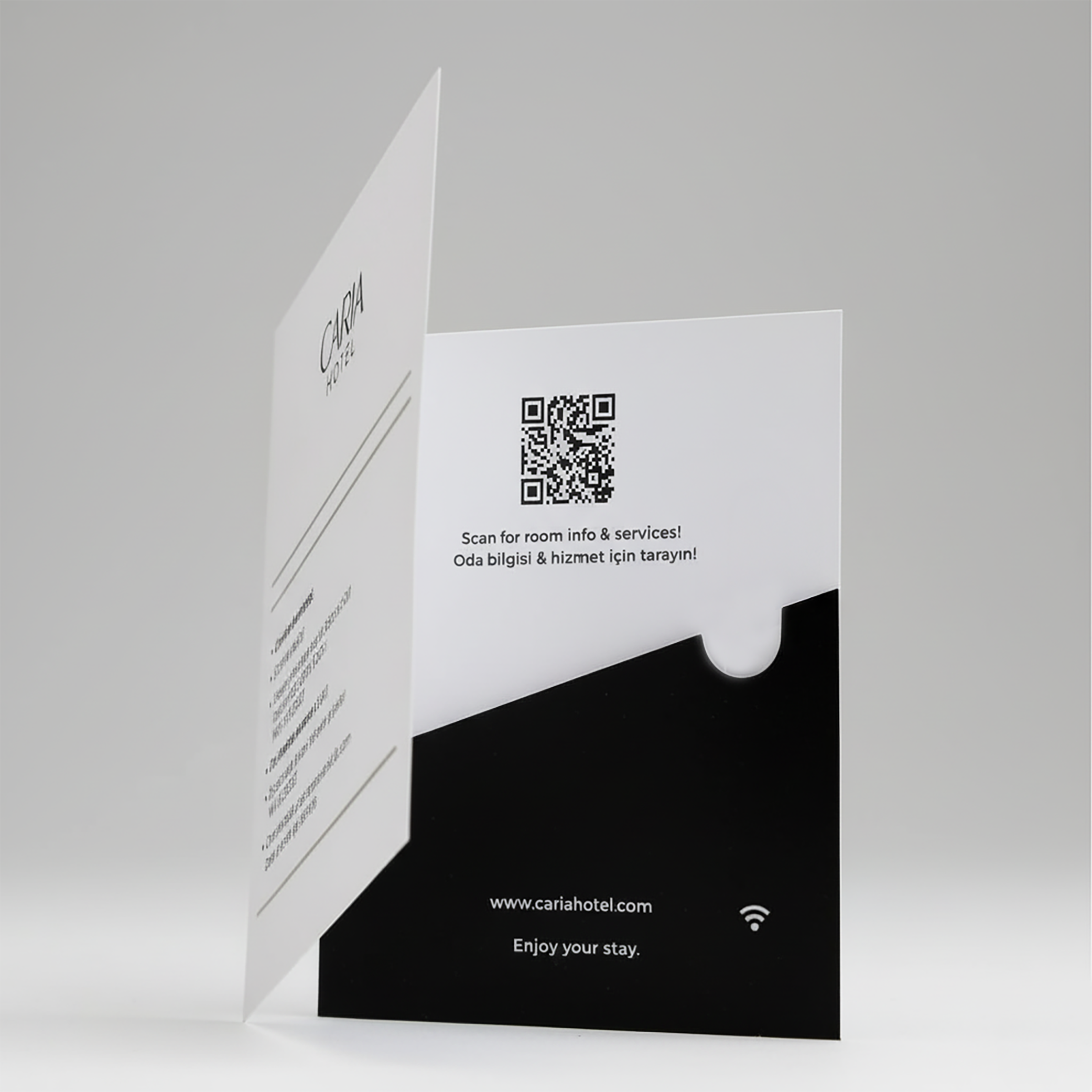 Oda Anahtarı Kart Kılıfı, otellerde kullanılan anahtar kartlarının düzenli ve şık bir şekilde misafirlere teslim edilmesini sağlar. 350 gr mat kuşe veya 350 gr parlak kuşe kağıt seçenekleriyle üretilen kılıflar, mat selefon veya parlak selefon uygulamalarıyla hem korunur hem de estetik bir görünüm kazanır. Üzerine otel logosu ve marka tasarımları uygulanarak kurumsal kimliği yansıtan bu kılıflar, hem işlevsel hem de prestijli bir detay sunar.