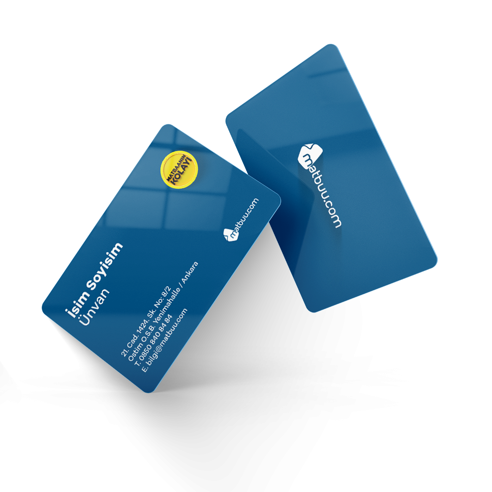 Yüzeydeki koruyucu kaplama aynı zamanda kartvizitin daha tok ve kaliteli bir his vermesini sağlar. Matbuu üzerinden kendi tasarımınızı yükleyerek PVC kaplı kartvizitlerinizi kolayca sipariş edebilirsiniz.
